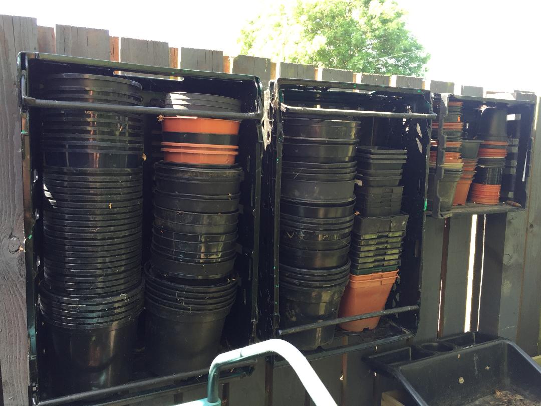 Here’s a quick tip for storing all those plastic flower pots which congregate in corners of your garden.