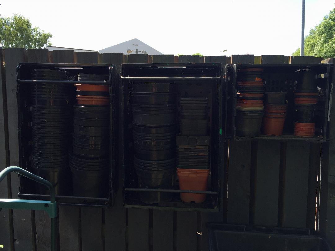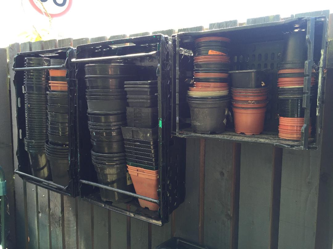 Screw the crate to the fence or wall and instantly not only do you have handy storage for all your pots but it lifts them off the ground to give you more useable space underneath – to fill with more garden stuff!
