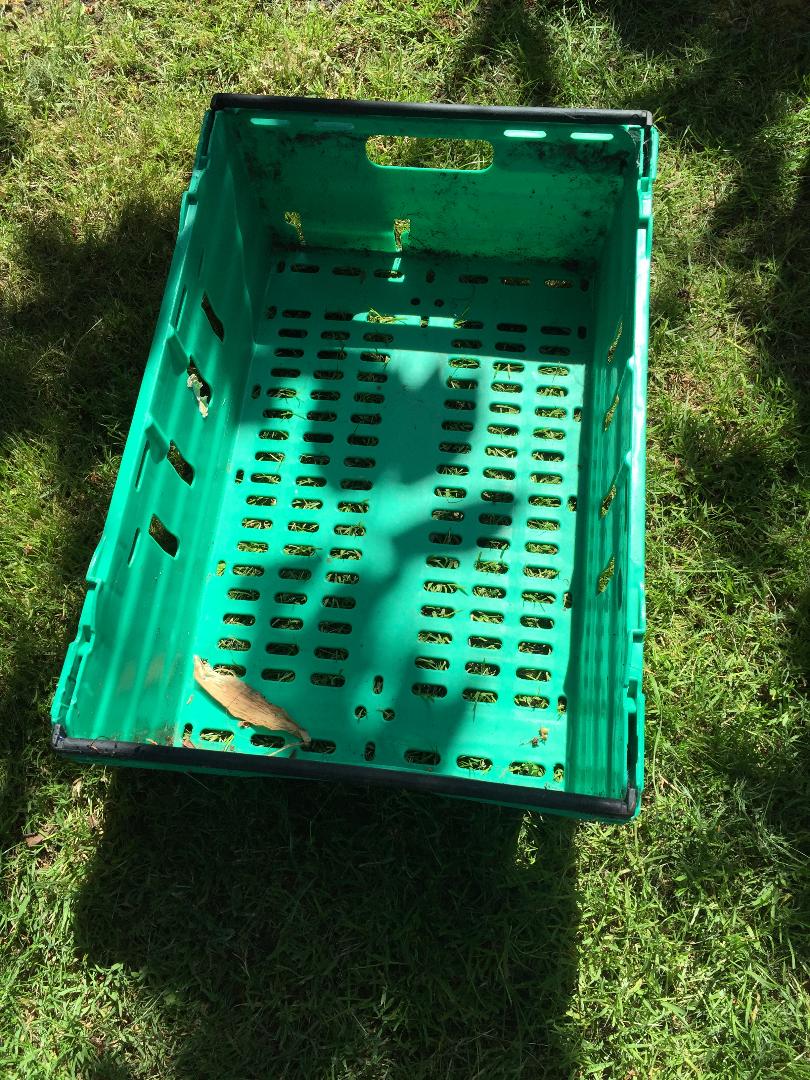 I spoke very nicely, to a very nice young man in a local supermarket who let me have some of the plastic crates which they use for transporting and often displaying fruit and veg. I then spray painted the bright green crate black which would better blend in with my grey fence and not make an obvious feature of my potting corner.