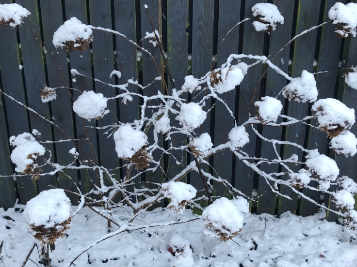 Pretty pictures! I love whenever snow rests on hydrangea flowers. The frost makes everything special!
