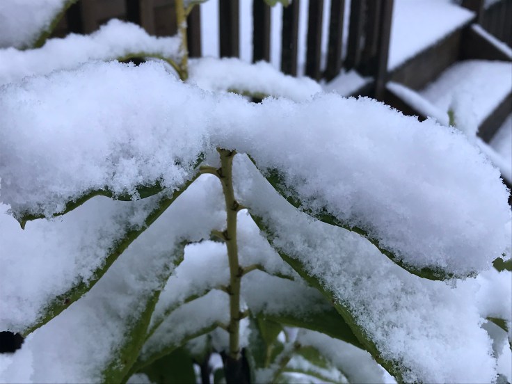 Maybe you’d like to see how much snow we had this week in Glasgow delicately balancing on the leaves of the Prunus Novita! Unfortunately, it didn’t last long and we just had heavy frost and icy patches for the rest of the week. Roll on the next fall of snow as the garden looks fantastic under a blanket of white!