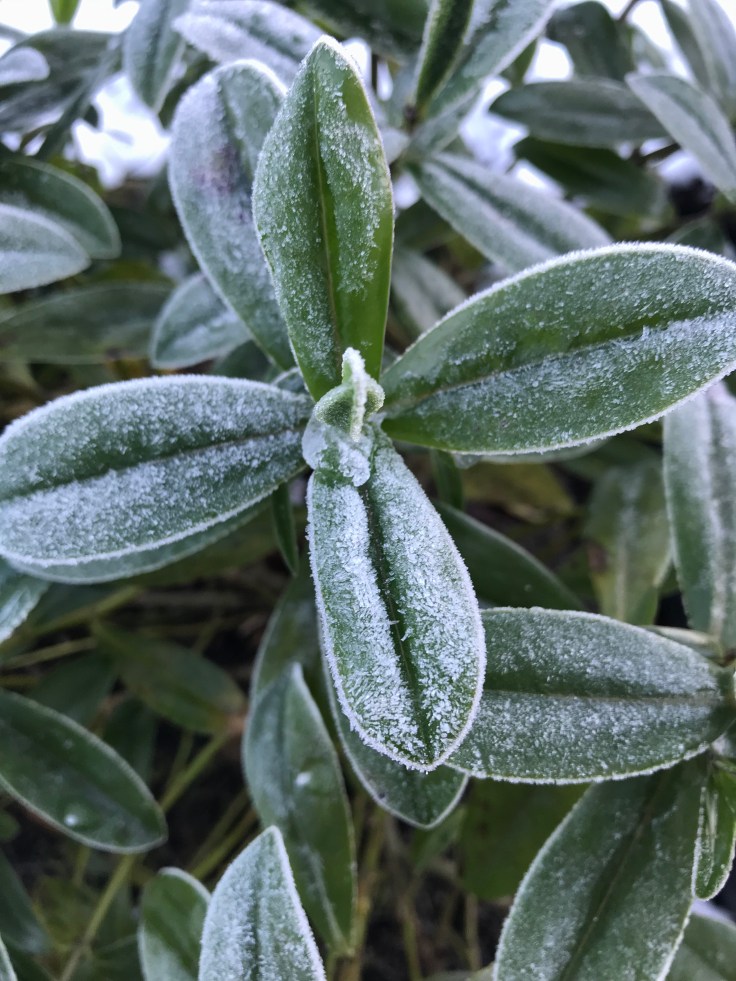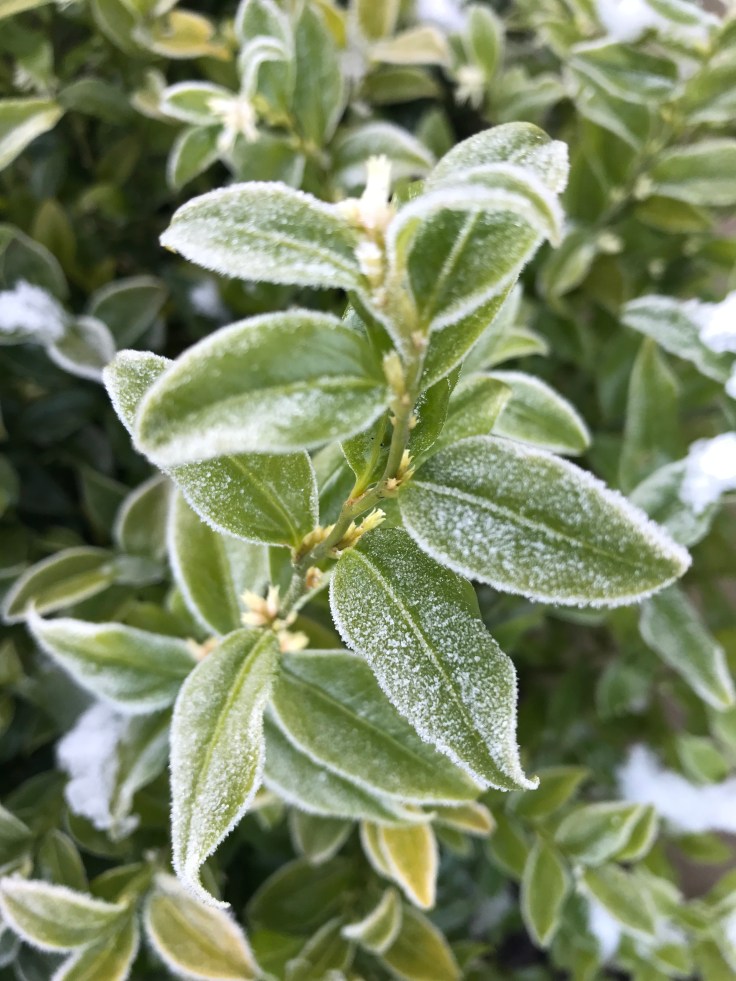 I don’t often get up and close and personal with a Choisya as this Choisya Ternata has never flowered but the frost covering really allows the evergreen leaves to be noticed in their perfect, symmetrical shape.