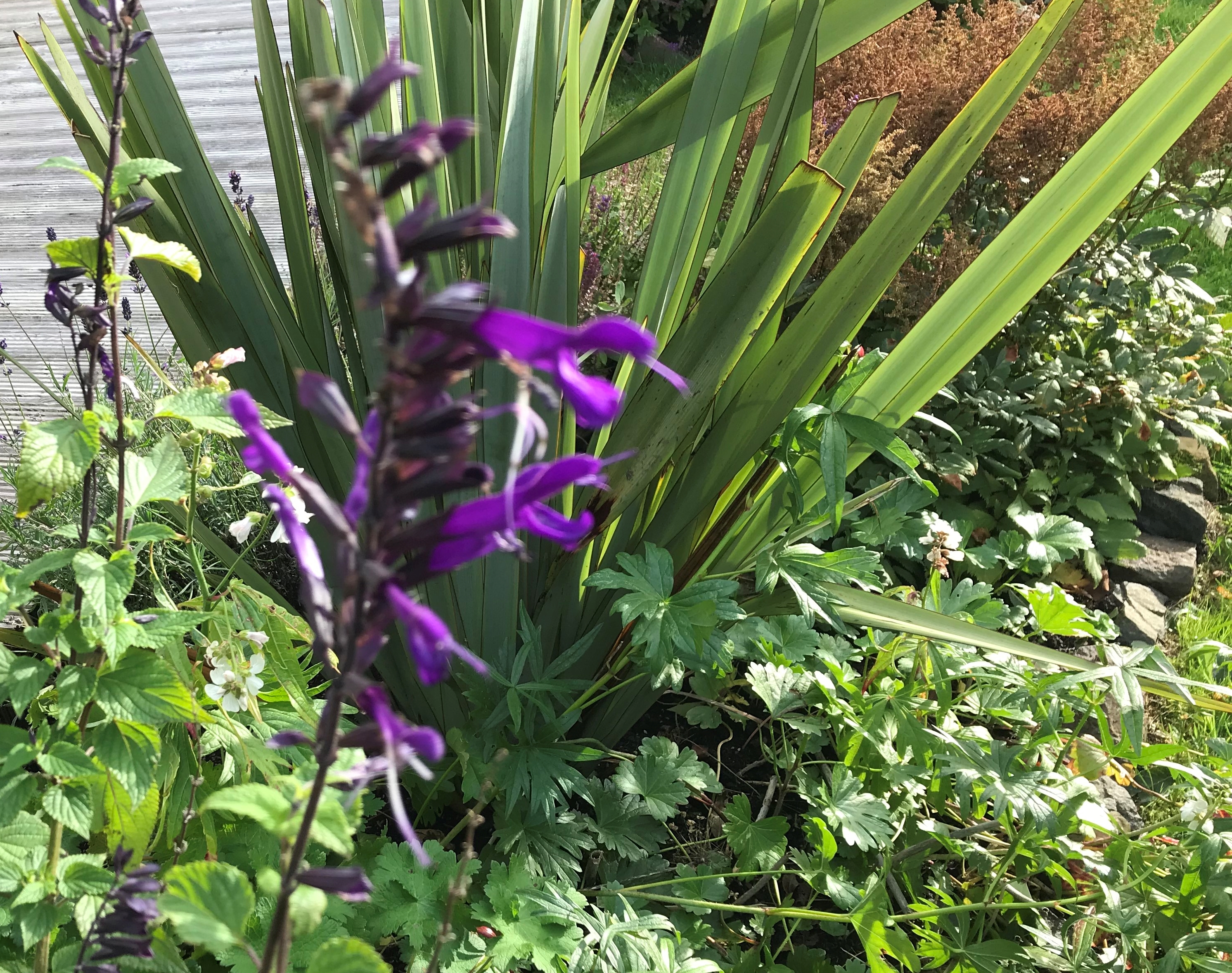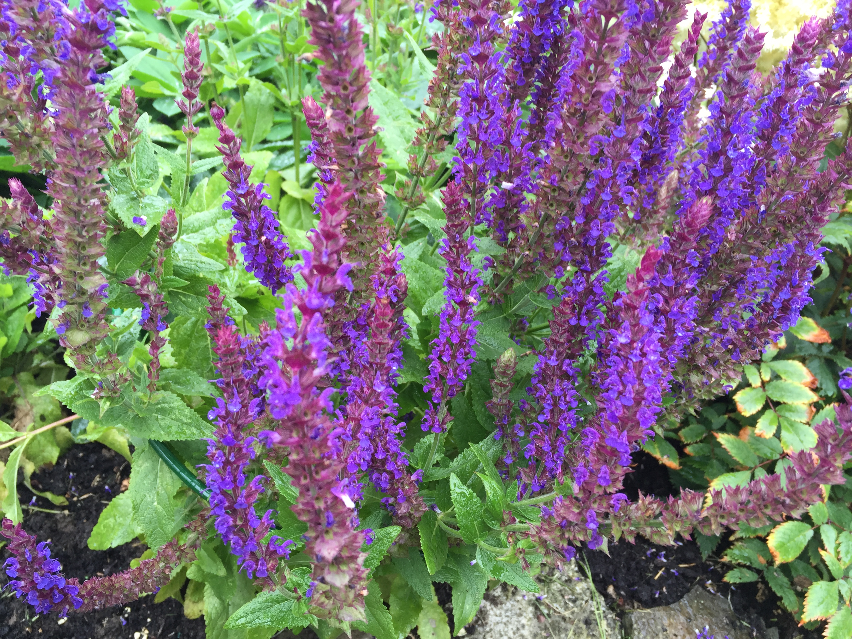 I use Salvia Nemerosa wherever there is a space. As purple is the dominant colour is my garden, these Salvias Nemerosa Ostfriesland pull the colour through the whole garden and help to unify the different borders. I have them planted in twos then in late May, once they are growing strongly, I give one of the pair the Chelsea Chop. This keeps one in bloom until late July and then just as it is going over, the Chelsea chopped one comes into play. This gives that purple vibe right through to Autumn.