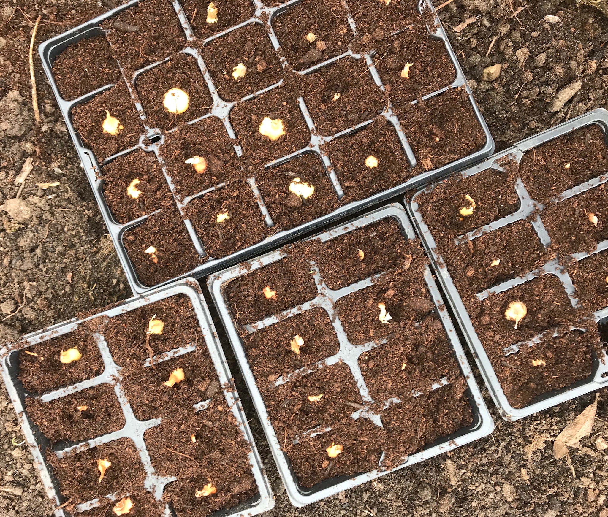 2.Pop the onion sets in, one to a module, with the pointy end facing upwards. Give them a little wiggle in with your fingers so just the tips are protruding. If you feel you haven’t used enough compost in each module, give them a gentle top up now.