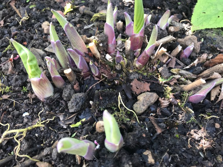 Hostas are perennial plants and they pretty much completely disappear in Winter so you always have to remember where you planted them. I love to see these little pops of green poking up through the soil during April, a sure sign that the Hosta is about to rise again!