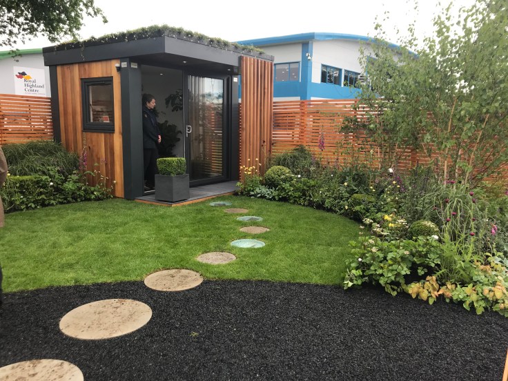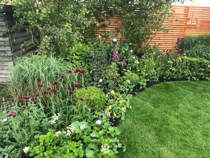 On arrival at The Royal Highland Centre, the first garden I saw was The Otherness Garden, designed by Tom Angel of Angel Horticulture. I instantly fell in love with this garden primarily because I like to see show gardens model a framework to which we can all aspire and this particular garden could be recreated in any small, urban back garden. The garden was themed around managing mental illness and included delicate but hardy planting to symbolise hidden resilience despite feelings of fragility. Hostas, Salvia Caradonna, Foxgloves, Circeum and Box were some of the common plants used, plants which we may all have in our garden but seen here in fabulous planting combinations.