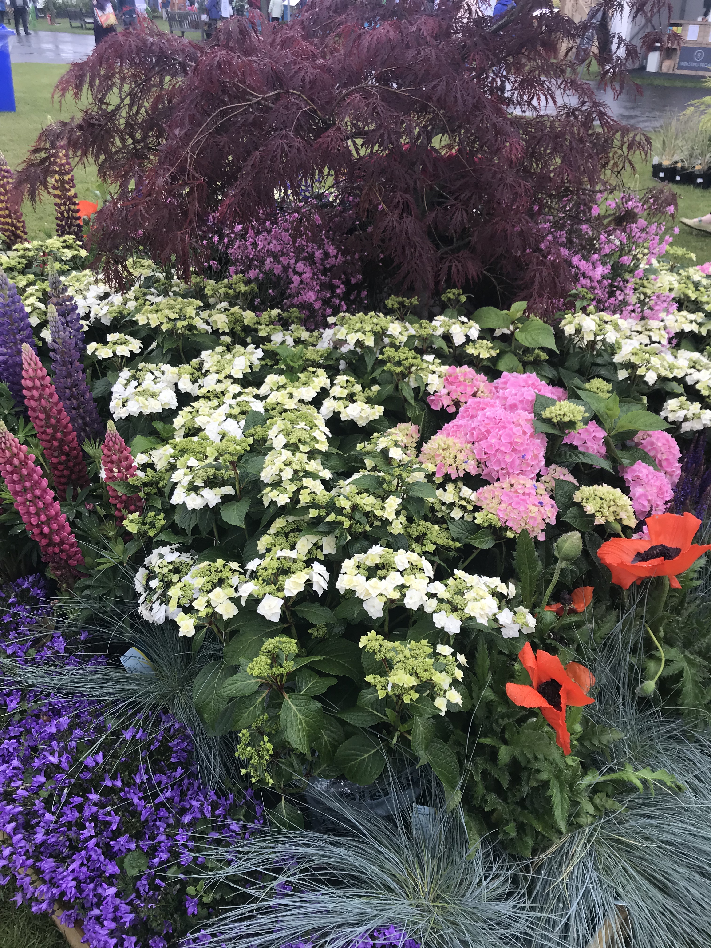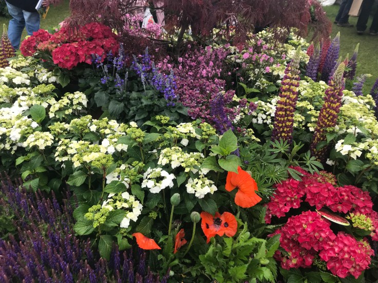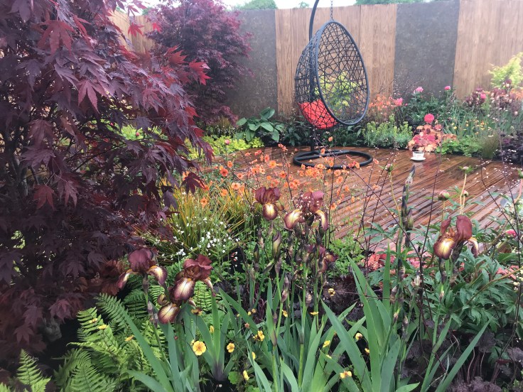 The other show garden which stood out was the Royal Botanical Gardens Edinburgh’s Coffee Garden designed by Kirsty Wilson with its exquisite shades of chocolates and oranges in the planting. There were six different types of Heuchera, Iris Kent’s Pride, Geum Totally Tangerine, Digitalis purpurea Sutton’s Apricot, Acer palmatum Bloodgood, Aquilegia vulgaris William Guiness and Paeonia Coral Charm packed in the planting surrounding the Coffee Bean decking.