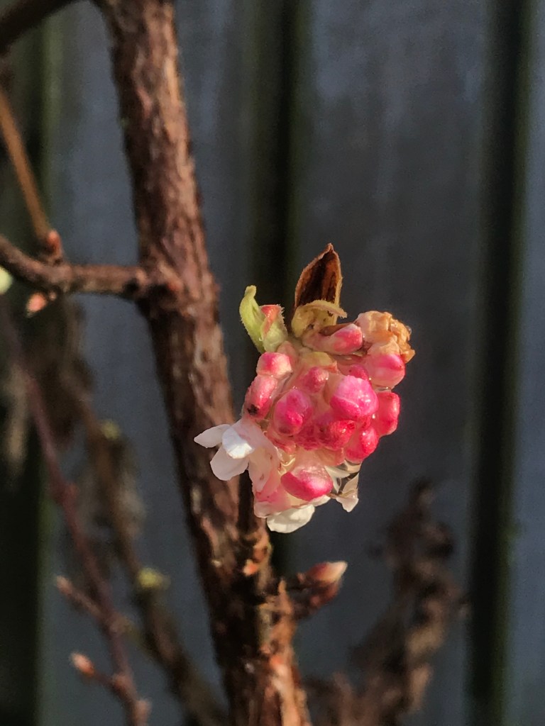 Second of this week’s joys is the emerging Viburnum x bodnantense ‘Dawn’ – isn’t this just a fabulous sight on bare stems? I must try and photograph this as it develops as it’s so pretty.