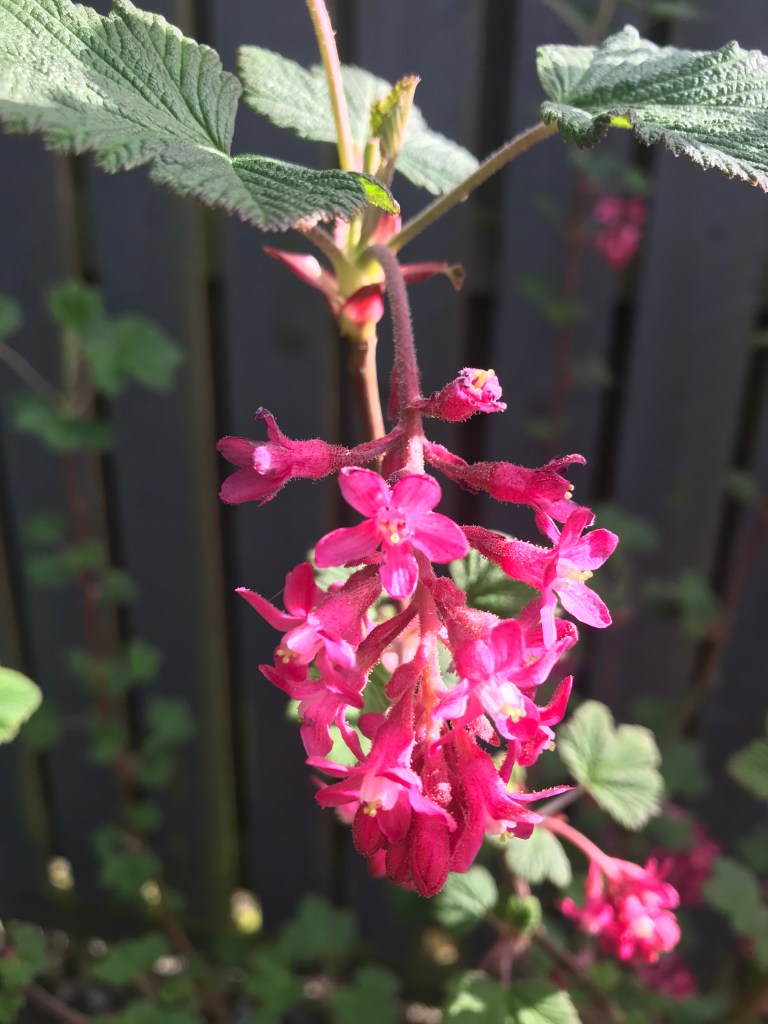 Ribes Sanguineum or Flowering Currant is an unexpected joy for me each year! I was given this shrub a few years ago by a friend who dug it up and wanted it out of their garden as they were changing things up. I have to confess, having nowhere to put it, it lay slumped in a random, ill-fitting pot in a corner for over a year until I finally planted it. It was so worth the wait, as every year, it never fails to disappoint with these fabulous, drooping flowers.