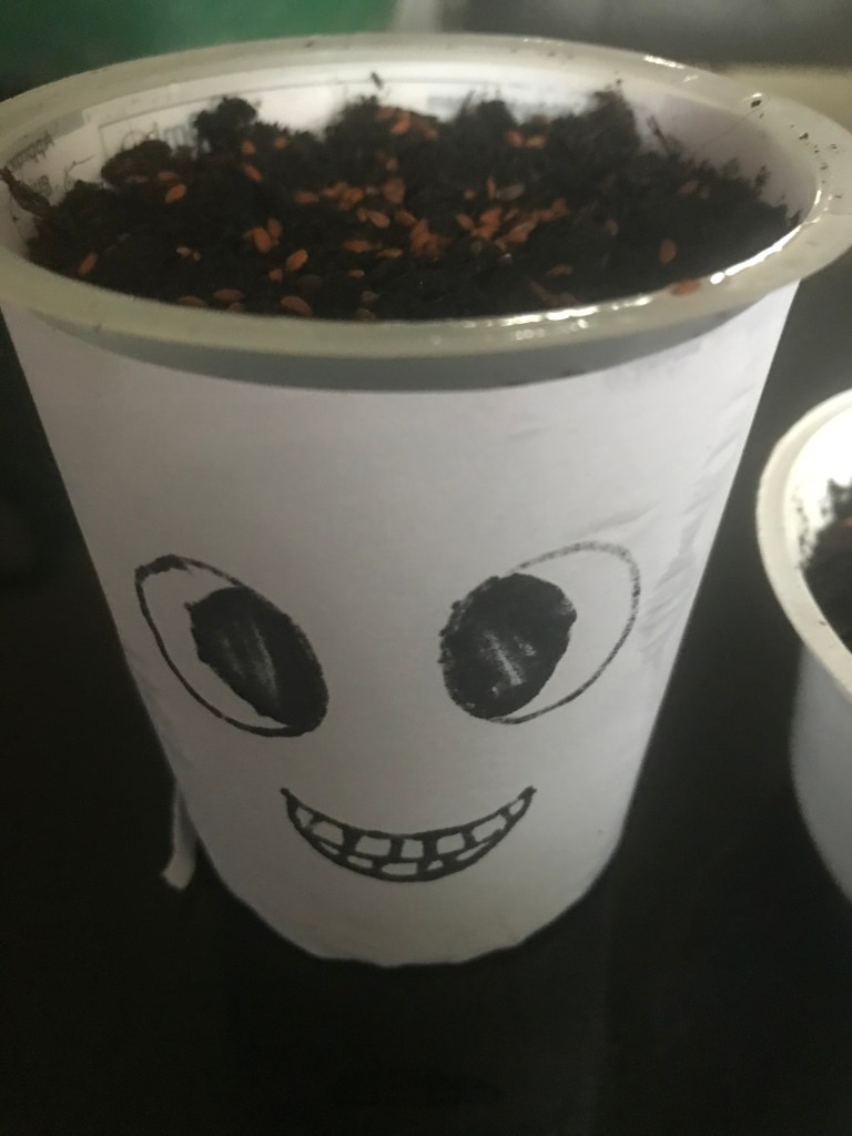 All you need is a used yoghurt pot or similar, some cress seeds which can be picked up in most supermarkets when you are doing an essential shopping and a little soil, or cotton wool if you don’t have any soil.