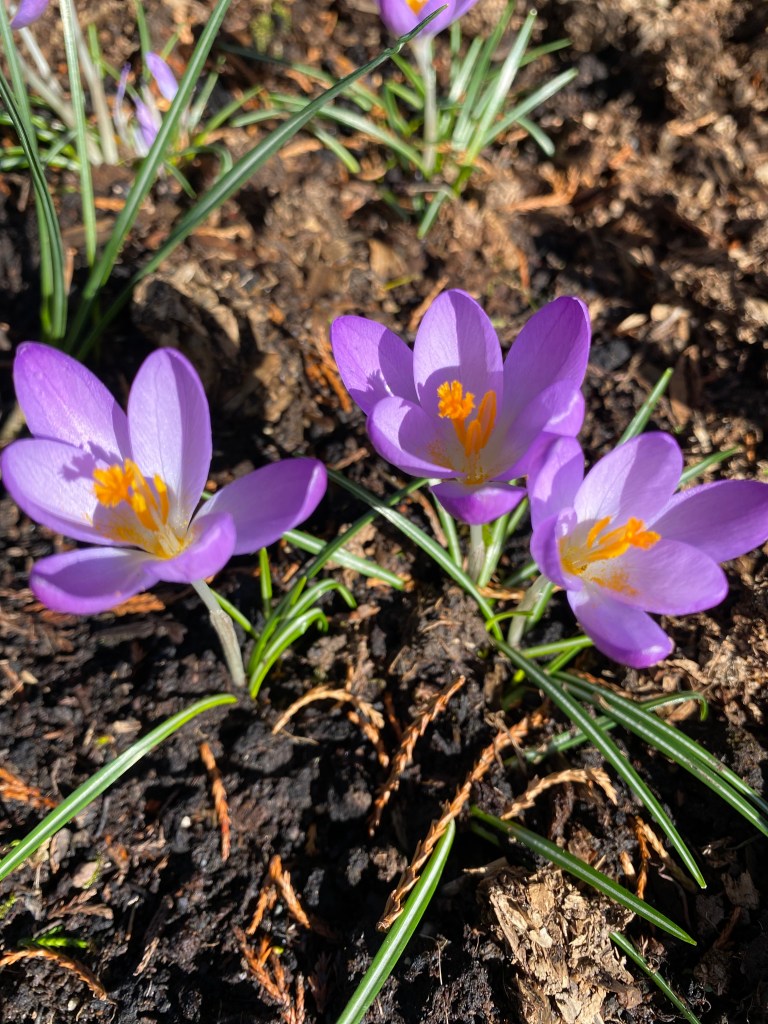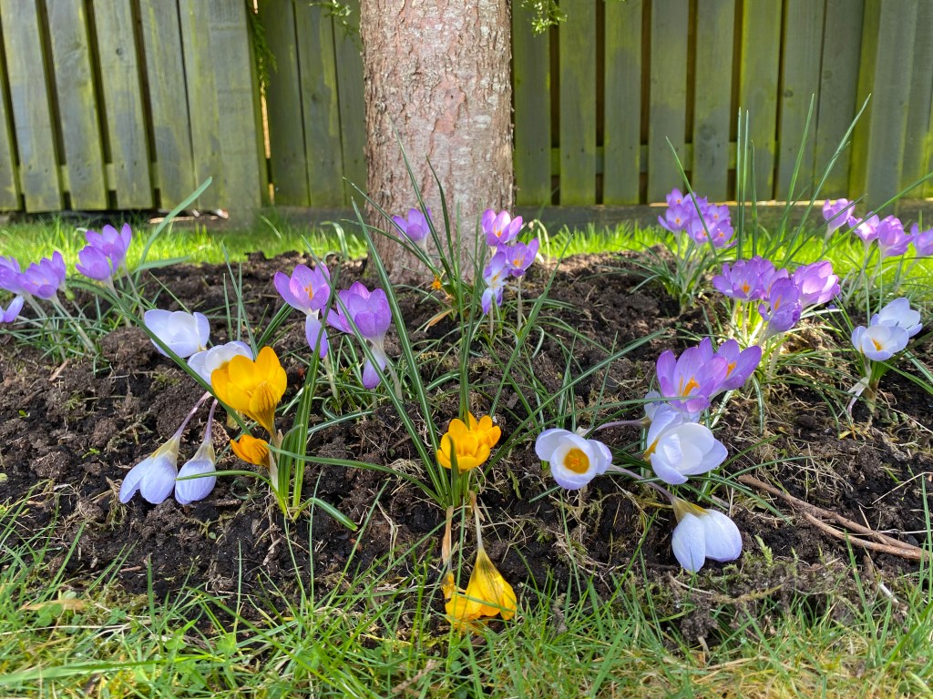 I started a little experiment two years ago in that dark, dry space under the conifer trees where nothing wants to grow by planting crocus bulbs in autumn. They flowered well last year so I added more last autumn and now this space is doing exactly what I want it to and providing a burst of colour in an otherwise, barren space. I have some snowdrops in the green to add in today and they’ll all hopefully bulk up for next year to give an even more delightful early display next spring.